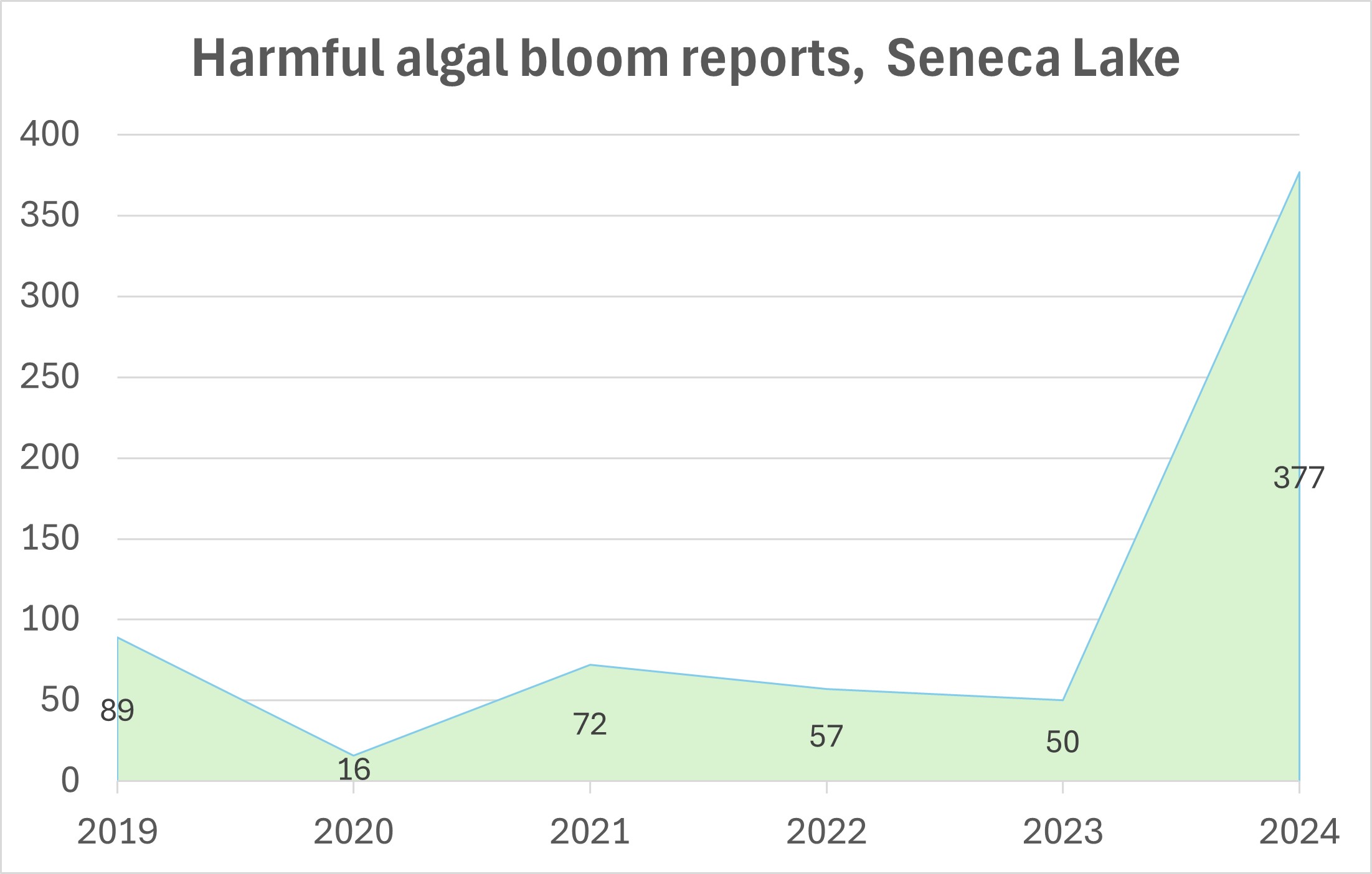 Harmful algal blooms (HABs) threaten freshwater lakes, ponds, rivers, and streams. Several types of cyanobacteria can produce toxins posing health risks to people and animals. The graph at rose shows reports of HABs in Seneca Lake.